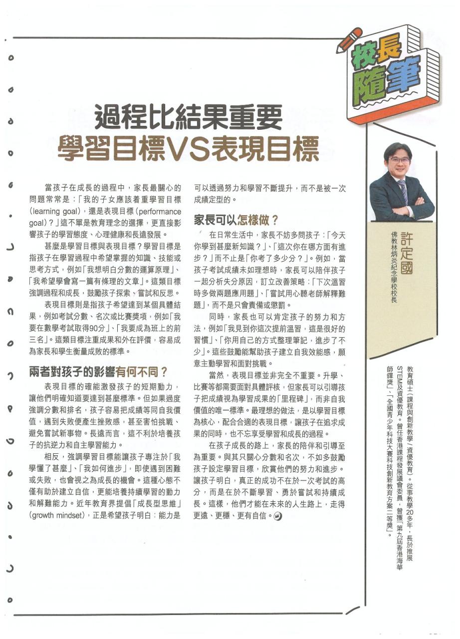 當孩子在成長的過程中,家長最關心的問題常常是:「我的子女應該著重學習目標(learning goal),還是表現目標(performance goal)?」這不單是教育理念的選擇,更直接影響孩子的學習態度、心理健康和長遠發展。