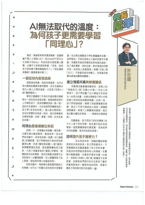 人工智能(AI)正以前所未有的速度重塑世界,某些技能甚至職業可能會被取代。作為未來社會的棟樑,新一代在求學期間該如何裝備自己?不少家長曾向許校長提問這些問題,他最近在親子雜誌專欄分享了相關答案。他認為,縱使AI可以取代繁瑣的運算和資料整理,但永遠無法取代人與人之間的溫度,尤其是同理心與團隊精神。他以早前五年級學生舉辦兩日一夜校內夜宿活動為例來說明。隨着科技不斷進步,獲取知識變得前所未有的容易,因此孩子是否具備競爭力,擁有「溫度」變得更加重要。