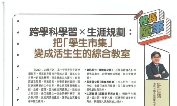 【Smart Parents校長隨筆:學生市集:跨學科專題的學習體驗 】在快速轉變的工作世界中,應如何裝備孩子以面對未來挑戰?許校長認為,跨學科學習是培育未來人才的有效方法,最近更在親子雜誌專欄中分享了本校在這方面的經驗。... 詳情