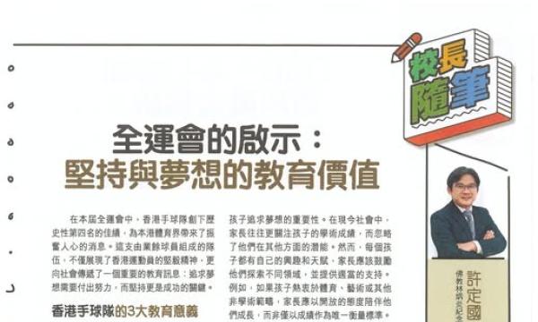 【Smart Parents校長隨筆:香港手球隊教曉我們的事 】運動員對夢想的堅持,絕對激勵人心!最近許校長在親子雜誌專欄中分享,參與本屆全運會的香港手球隊的故事。16名選手中有15人不惜辭職或停薪留職,專注訓練全力備戰,... 詳情